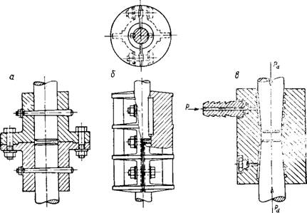 При значительной высоте аппарата необходимо предусмотреть дополнительные соединения для вала, состоящего из нескольких частей. Соединение должно обеспечить возможность передачи кру]тящего момента, передачи напряжений, связанных с весом вала и ротором, а также соосность обоих валов. Вал привода соединяется с валом мешалки при помощи жесткой или упругой муфты сцепле]ния. Желательно, чтобы соединение было упругим, так как в этом случае смягчаются удары при передаче крутящего момента с вала привода на вал мешалки. Как правило, в приводах, работающих при высоких числах оборотов применяются упругие муфты, а при средних и низких числах оборотов упругие и жесткие. Отдельные же элементы вала соединяют с помощью жестких муфт. Различные типы соединений (жестких муфт) показаны на рис. 11-44. Варианты б и решение в обладают тем преимуществом, что они обеспечивают точную соосность обеих частей вала.
